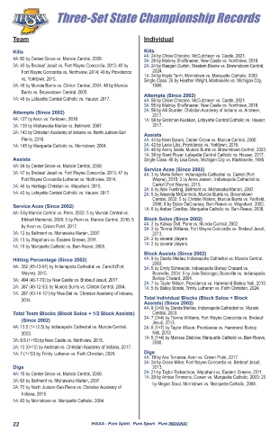2A: 70 by North Judson-San Pierre vs. Christian Academy of by Megan Stout, Morristown vs. Marquette Catholic, 2004. 2A: 68 by Wapahani vs. Providence, 2012. Digs