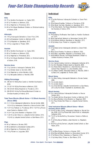 2A: 70 by North Judson-San Pierre vs. Christian Academy of by Megan Stout, Morristown vs. Marquette Catholic, 2004. 2A: 68 by Wapahani vs. Providence, 2012. Digs